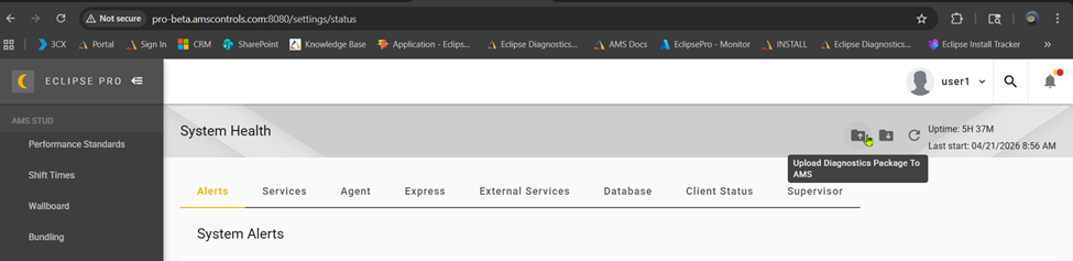 You can upload a Diagnostics package from the System Health page that will automatically upload the Diagnostics logs to AMS Controls.